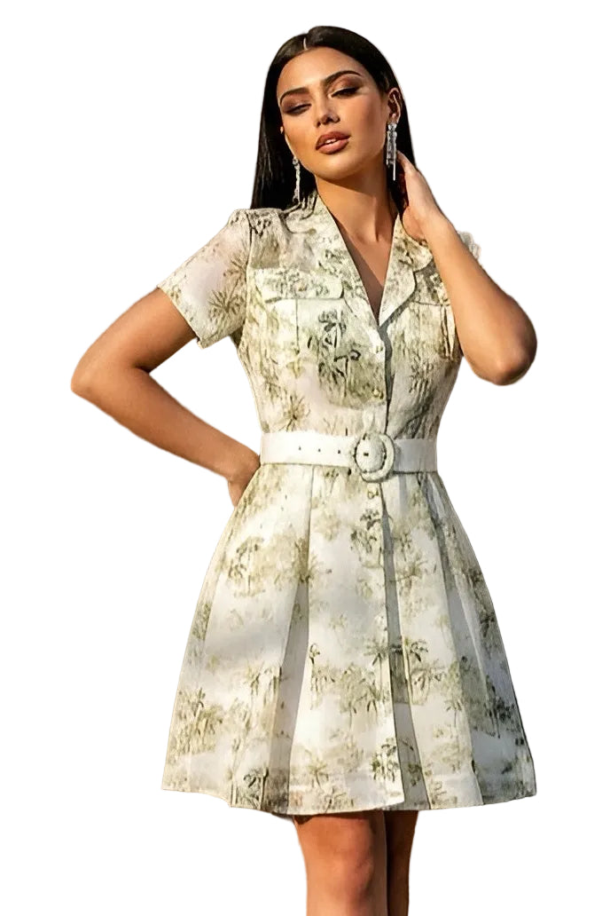 Olive Green Printed Mini Dress with a soft, nature-inspired print in olive tones on a light base. This shirt-dress style features a structured collar and a button-front bodice for a clean, polished look that’s easy to dress up or down.