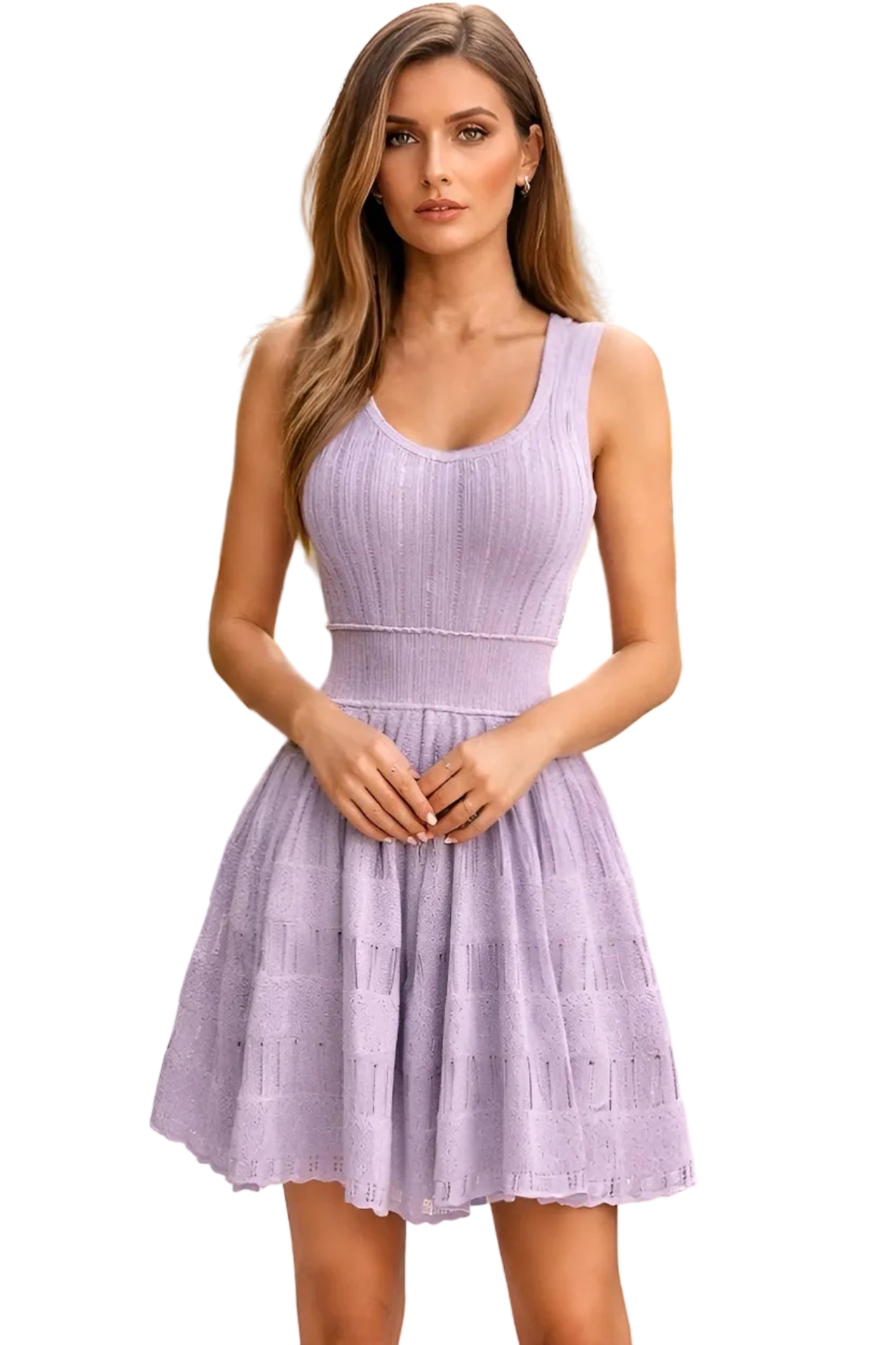 Purple Mini Dress (StylePSF02428) is a sleeveless fit-and-flare mini dress in a soft lavender-purple shade. The bodice features a scoop neckline and a vertically ribbed texture that creates a streamlined, close-to-the-body look through the top.