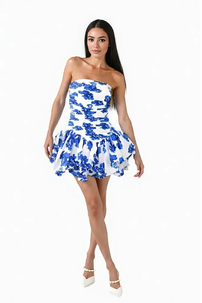 White /Blue Printed Tube Mini Dress