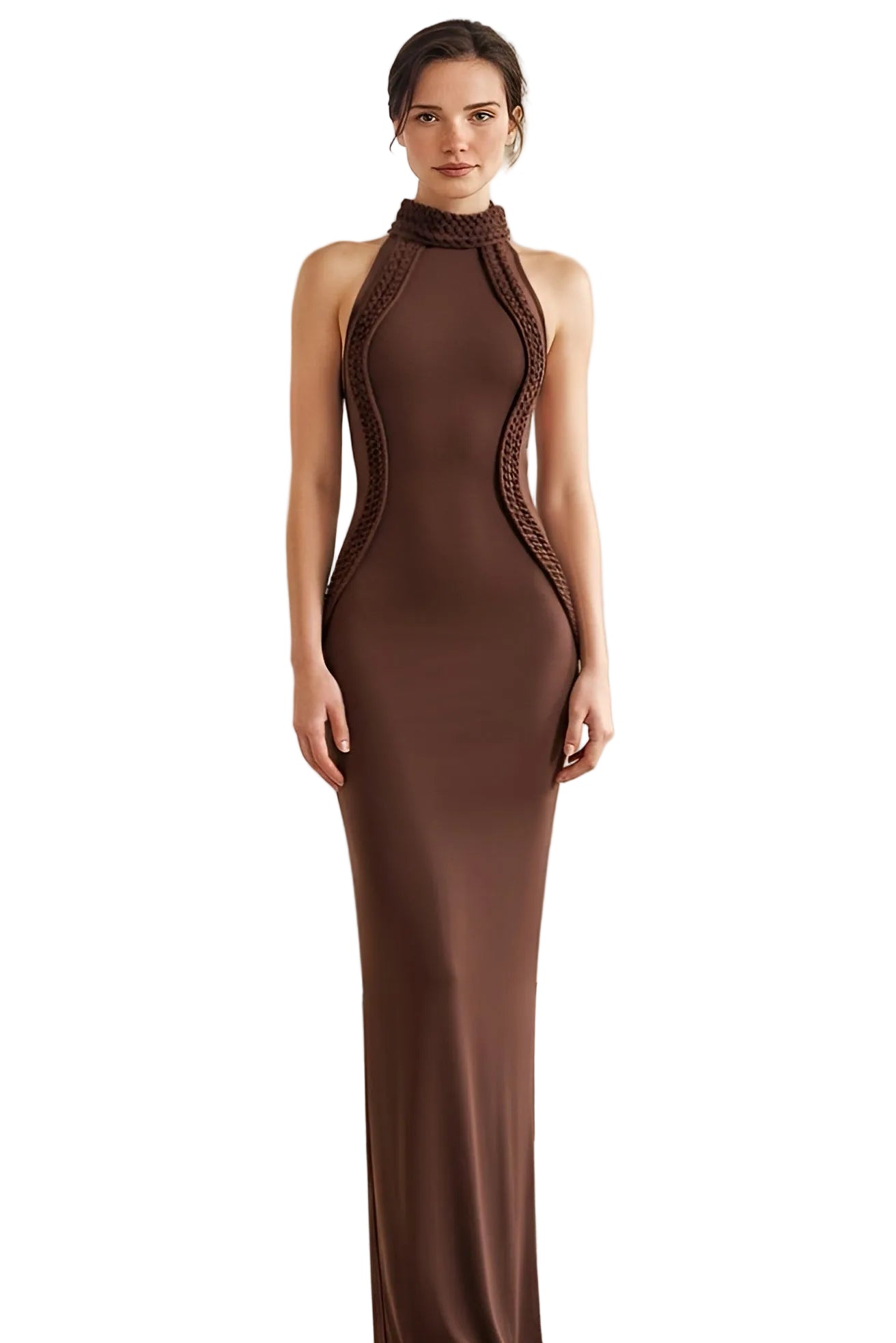 Designed in a deep dark brown tone, this maxi dress features a sleek halterneck and sleeveless cut that highlights the shoulders. The fitted silhouette is elevated with intricate braid detailing and subtle mesh panelling for a modern, textured finish. A rear slit allows ease of movement, while a concealed rear zip fastening ensures a smooth, streamlined fit. Finished at a maxi length, this piece delivers understated elegance with a contemporary edge.