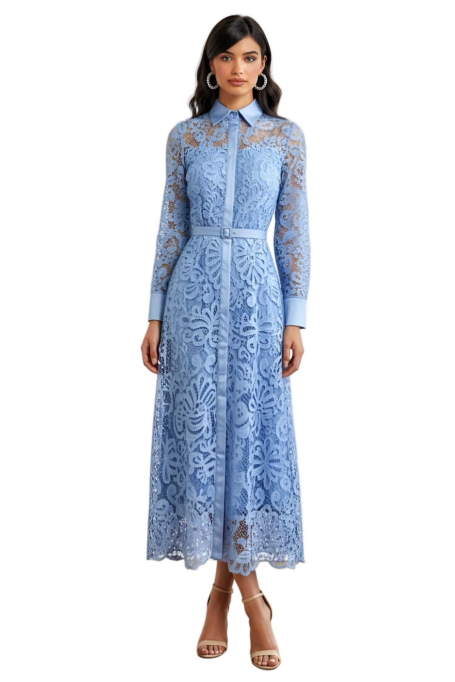 This powder blue rochet laces maxi features a classic collar, button closure at the front, removable belt at the waist, and long sleeves with cuffs.