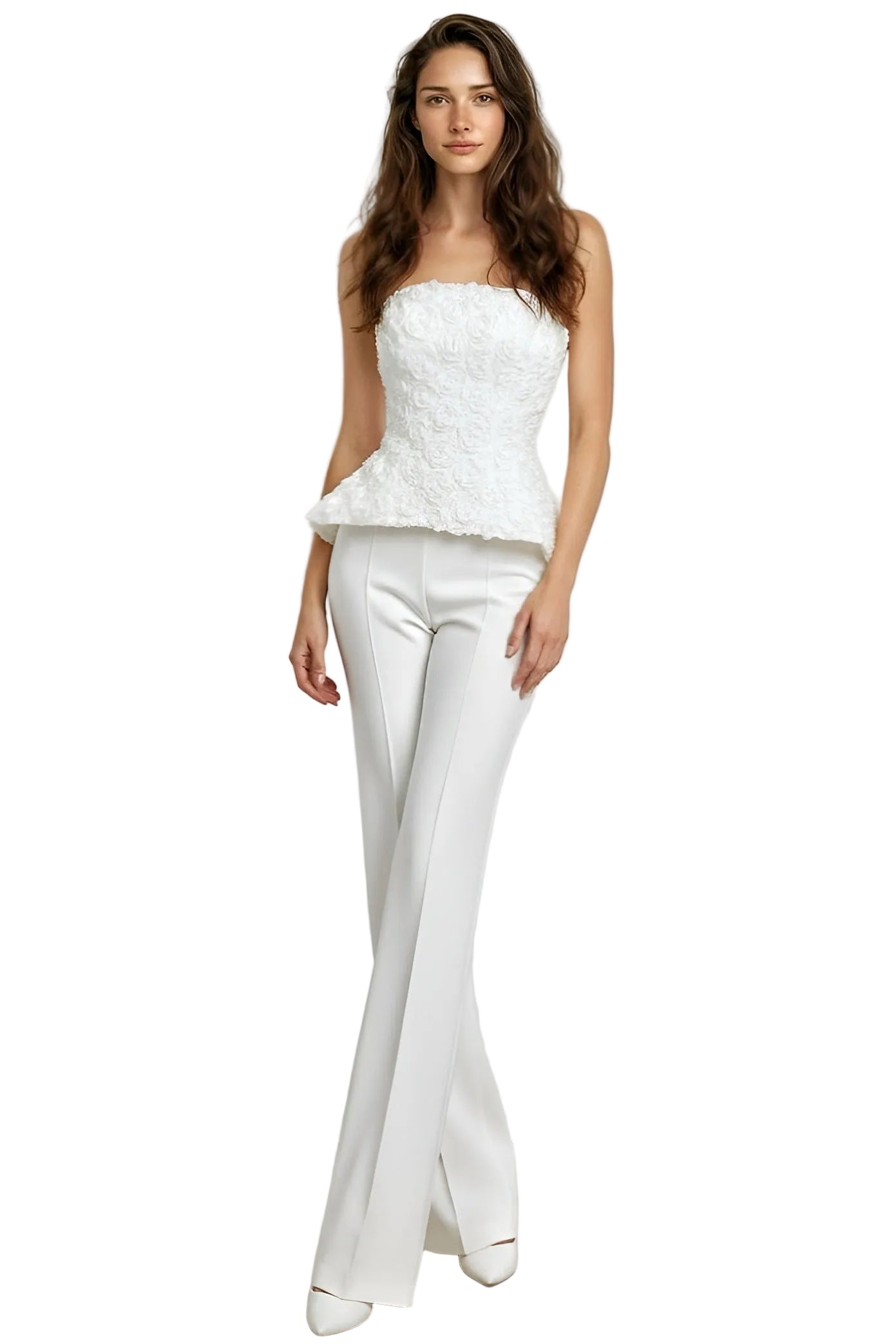 Designed with a sleek bandeau neckline, this structured top is accented with dimensional 3D floral detailing for a statement finish. The peplum waistline enhances the silhouette, while full lining ensures comfort and coverage. An exposed zip closure at the back adds a modern touch, completing this refined yet fashion-forward piece.